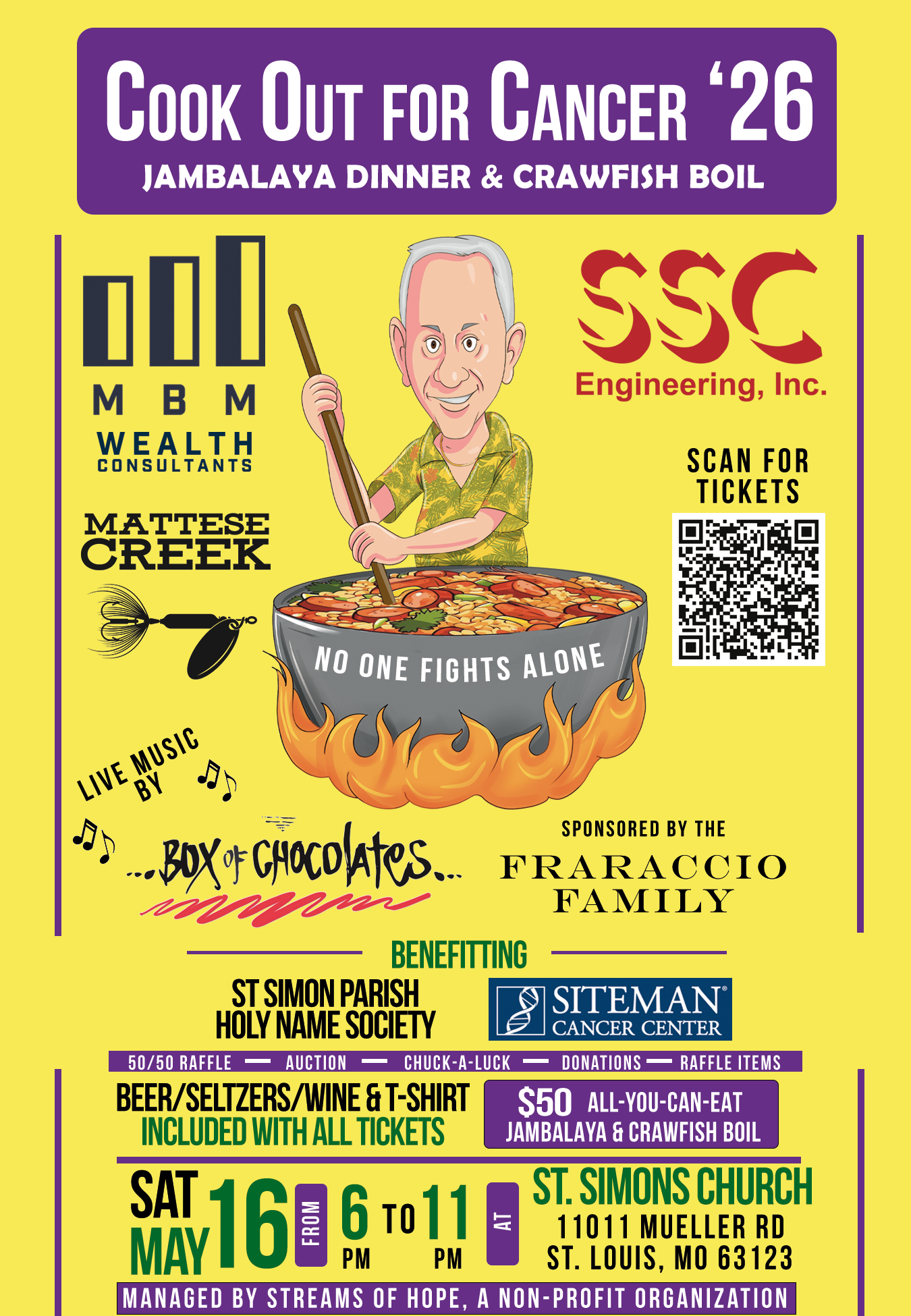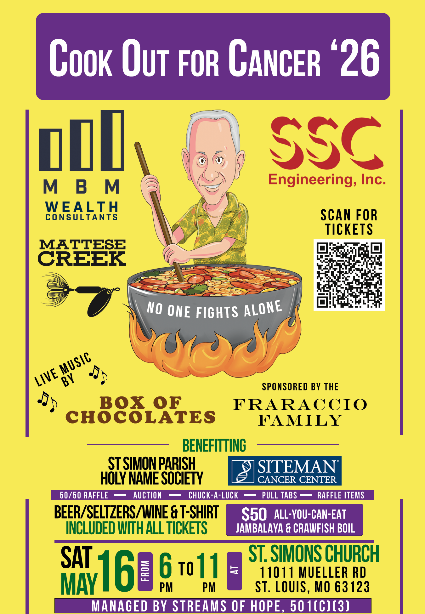 2026 Cookout for Cancer Saturday, May 16, 2026 6:00 PM 11:00 PM St. Simons Church 11011 Mueller Road St. Louis, MO, 63123 United States (map) Google Calendar ICS Buy Your Tickets Here